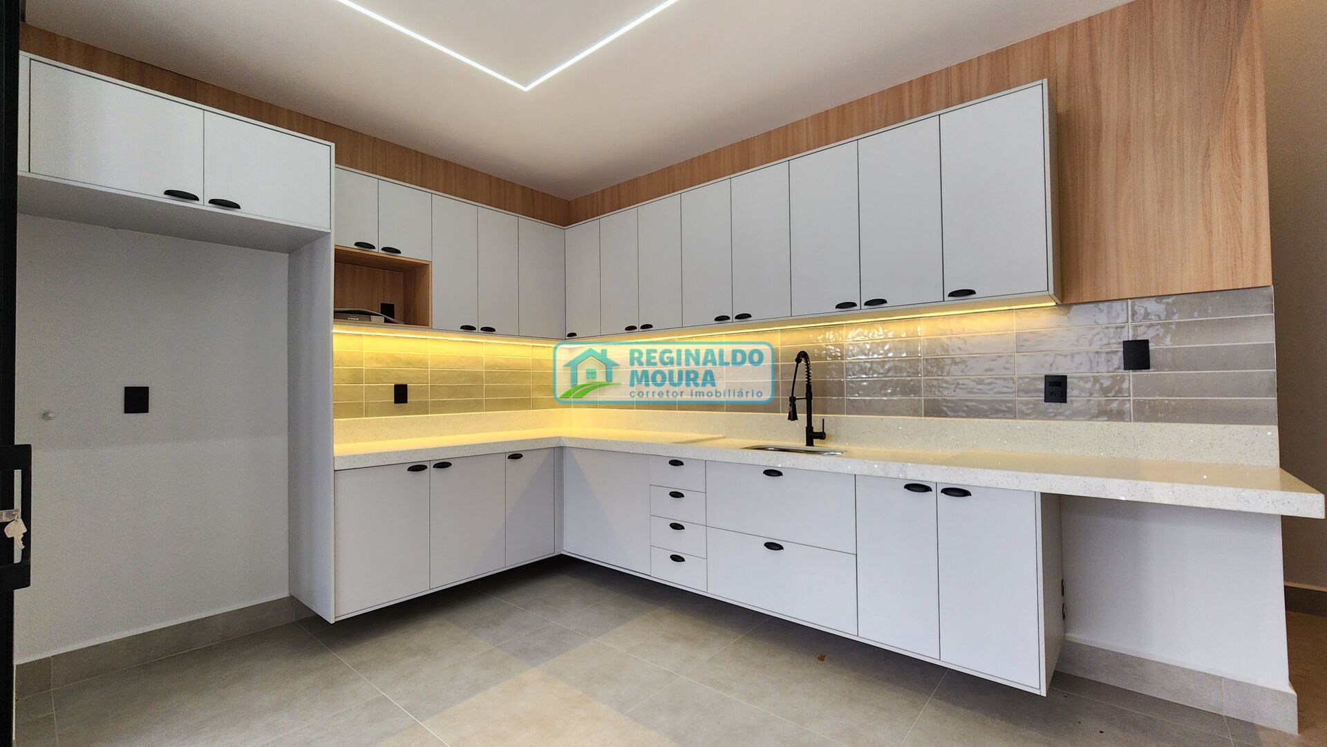 - Cozinha de Chef & Gourmet: Bancadas em Mármore Branco Stellar e Preto São Gabriel. Cozinha americana totalmente integrada à área gourmet.