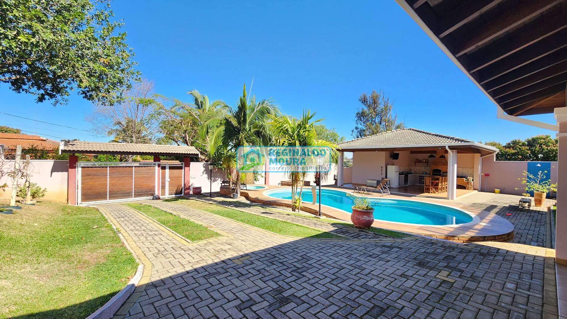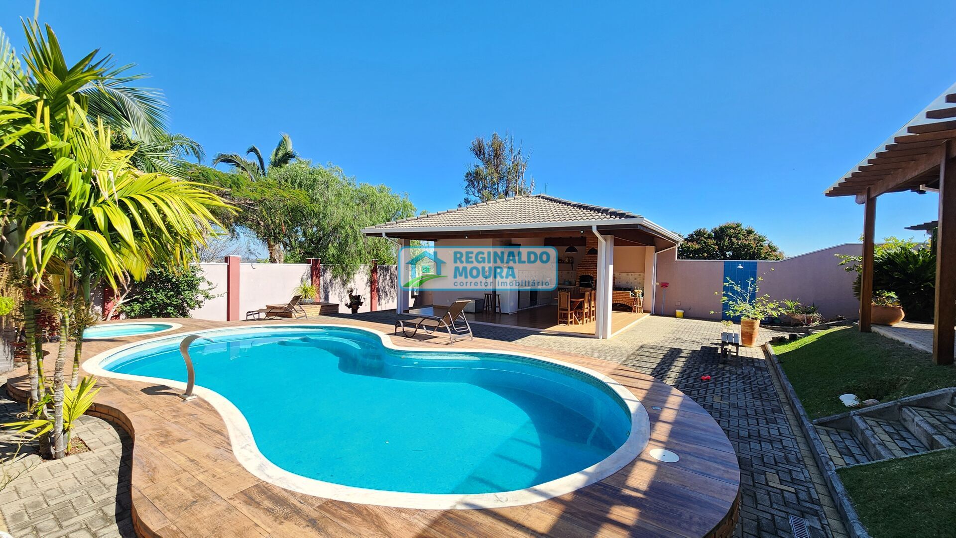 - Área gourmet completa: churrasqueira, forno e fogão a lenha, fogão embutido e armários planejados. Tudo isso ao lado da piscina e dos banheiros de apoio.